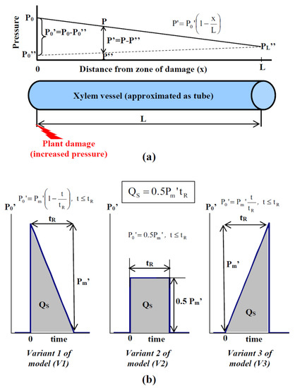 (a) Scheme of the pressure distribution in a xylem vessel, which is approximated by a tube of length equaling to L. P0”, PL”, and P” are pressures without damage in the initial (x = 0), terminal (x = L), and intermediate (0 < x < L) points of the vessel, respectively; it is assumed that P0”, PL”, and P” are not dependent on time; P” is a linear function of x (see Equation (3) in Section 2). P0 and P are pressures in the initial (x = 0) and intermediate (0 < x < L) points of the vessel, respectively, after the start of action of a stressor; they are time dependent, and P is also dependent on x. P0’ and P’ are the increases in pressure above pressure values without stimulation. It is also assumed that a stimulation acts on the initial point of the vessel and induces the transient increase in P0’ and, therefore, P’. The equation that describes the relations between P0’ and P’ is also shown in the figure (see Section 2 for details). (b) Variants of stimulation-induced increases in pressure (P0’) that are used in our analysis. An instant initial increase in pressure and a subsequent linear decrease during the time of response (tR) are assumed for Variant 1 (V1) of the variation potential (VP) propagation model. V1 is in accordance with the short-term and highly intensive action of damages (e.g., burning or crush, which are widely used damages for VP induction [1,5]). Constant increased pressure during the time of response is assumed for Variant 2 (V2) of the model. V2 is in accordance with the long-term and constant action of a stressor (e.g., an artificial increase in pressure in a part of the shoot, which was used in some experiments [44]). The long-term increase in pressure during tR and its instant decrease after that are assumed for Variant 3 (V3) of the model. V3 most probably is in accordance with the increase in the intensity of the action of a stressor (e.g., gradual heating, which can be also used for the induction of VP [63,69]). The maximum pressure increases are Pm’ for V1 and V3 and 0.5Pm’ for V2. QS is the integral of total changes in pressure (marked gray) in the initial point of the xylem vessel (integral of P0’). The equation for QS is shown in the figure (it is similar for V1, V2, and V3). Equations that describe the dependence of P0’ on time are also shown in the figure (see Section 2 for details).