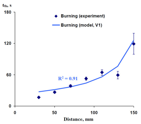 Experimental and simulated dependence of the time of initiation of variation potential (tth) on the distance from the burned zone in wheat seedlings. We used experimental data from our previous work [62]. The length of the xylem vessel (L) is assumed as 200 mm (on the basis of [62]). The duration of hydraulic changes in the damaged zone (tR) is assumed as 200 s. The ratio of the P’ integral, which is necessary for variation potential induction, to the total P0’ integral in the zone of damage (N) is assumed as 0.13. Only Variant 1 (V1) of the model was used in this analysis (see Figure 1b). It is assumed that V1 (instant initial increase in pressure and subsequent linear decrease) is in accordance with the action of short-term burning. R2 is the determination coefficient.