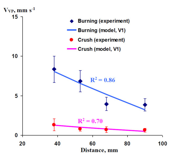 Experimental and simulated dependence of the rates of propagation of variation potential (VVP) on the distance from the damaged zone in pea seedlings. We used experimental data from our previous work [63], which analyzed the propagation of variation potential for 275 mm. The duration of hydraulic changes in the damaged zone (tR) is assumed as 50 s (for burning) or 325 s (for crush). The ratio of the P’ integral, which is necessary for variation potential induction, to the total P0’ integral in the zone of damage (N) is assumed as 0.58 (for both burning and crush). Only Variant 1 of the model (V1) of the model was used in this analysis (see Figure 1b). It is assumed that V1 (instant initial increase in pressure and subsequent linear decrease) is in accordance with the action of short-term burning or mechanical wounding. R2 is the determination coefficient.