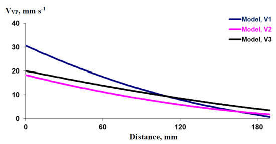 Using Equations (11)–(13), we derived Equations (16)–(18) for describing the dependence of the rate of VP propagation (VVP) on the distance from the damaged zone (x) in V1, V2, and V3, respectively. These equations were based on a description of VVP as dx/dtth. Equations (16)–(18) can be used at x ≤ xmax.