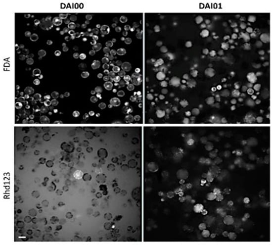 We used two strategies to monitor the kinetics of cell viability: labeling with fluorescein diacetate (FDA) dye that indicates leakiness from the cells and labeling with rhodamine 123 (rhd123) dye that characterizes cell activity (Figure 1). Fluorescein diacetate (FDA) is a non-fluorescent hydrophobic fluorescein derivative that readily passes through the cell membrane. In the cytoplasm, FDA is converted by intracellular esterases/proteases into fluorescein, which emits green fluorescence. Fluorescein is not retained in the cytoplasm but moves into different cell compartments; it is particularly accumulated in the chloroplast thylakoids, mitochondria, or vacuoles. For this reason, labeling is non-uniform and unsuitable for automatic analysis. The high negative charge of FDA fluorescein also interferes with cell activity and prevents cell proliferation. Therefore, the use of FDA is restricted to checking the quality of the isolated protoplasts and the suitability of the culture conditions during the first 24 h after isolation.