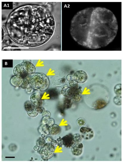 In addition, the Arabidopsis root, unlike the roots of other species, has only a single cortical layer, so the root protoplast population is very heterogeneous. For this reason, only a small number of protoplasts remain competent for cell reprogramming after their isolation from roots. However, isolation is possible, and cell division can be achieved (Figure 6) by first inducing activated pericycle cells to formed callus-like structures and then isolating the protoplasts from the calluses. However, these protoplasts cannot be viewed as true root protoplasts as they are the protoplasts of pericycle-derived callus cells [8].