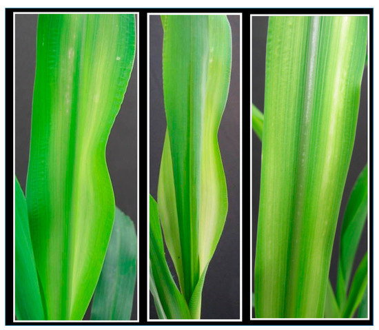 Zinc deficiency symptoms on young leaves of maize plants.