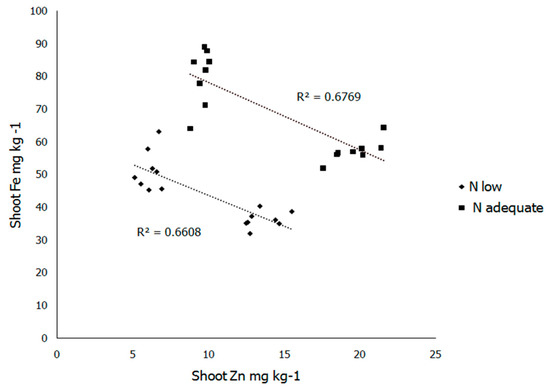 Correlation between shoot Zn and Fe concentrations under different N soil supply. Data for 25. days old maize plants. N rates: low (125 mg of N/kg of soil), (---, ■), and adequate (250 mg of N/kg of soil), (---, ♦).