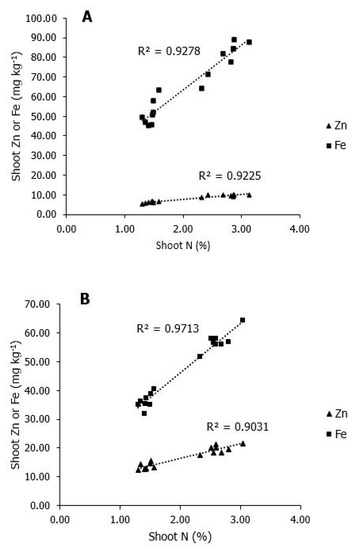 Correlations between Zn, Fe and N concentrations in maize shoot under different Zn soil supply. (A) Low Zn soil supply. (B) Adequate Zn soil supply. Data for 25 days old maize plants. Fe maize shoot concentration (---, ■), Zn maize shoot concentration (---, ▲).