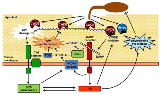Overview of responses induced by cell wall damage during pathogen infection. CW, cell wall; CWDE, cell wall-degrading enzyme; CWI, cell wall integrity; PTI, pattern-triggered immunity; DAMP, Damage-Associated Molecular Pattern; BBEL, berberine bridge enzyme-like protein; oxDAMP, oxidized DAMP; POD, peroxidase; ROS, reactive oxygen species. CWDEs secreted by the pathogen degrade CW structural polysaccharides. CW damage activates the CWI perception system, mediated by dedicated sensors, triggering CWI maintenance responses, that include production of ROS mediated by membrane NADPH oxidases and apoplastic PODs, and reinforcement of the CW. Host-encoded inhibitors reduce CWDE activity, slowing down CW degradation and promoting the accumulation of CW-derived DAMPs. Perception of DAMPs by membrane-localized receptors in turn activates PTI, which leads to antimicrobial defence responses, including production of phytoalexins, PR proteins and ROS, that contribute to restrict infection. Negative and positive crosstalk between CWI and PTI fine-tune defence responses triggered by CW damage. DAMPs can be inactivated by apoplastic BBEL proteins, that oxidize CW-derived oligosaccharides, at the same time producing ROS. Some pathogens can secrete decoy proteins that bind to CWDE inhibitors.
