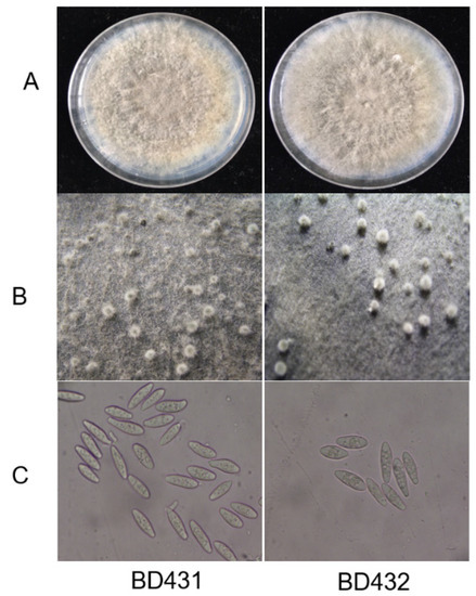 Naturally diseased fruits were healthy in appearance, with soft tissues and slightly sunken infected sites (Figure 1A). Infected branches or trunks of trees had warts (Figure 1B). Isolates (24) were isolated from all the samples, 12 isolates (include Bd431) come from the diseased fruit, while 12 isolates (include Bd432) come from the wart. On potato dextrose agar (PDA), initially greenish-brown to gray colonies were formed by all isolates, which were then turned into dark gray after the incubation of five days (Figure 2A). After nine days, the isolates started to produce pycnidia (Figure 2B). Conidia were hyaline, unicellular, and fusoid, the size of the conidia of isolates producing abundant spores was (21.2–27.5) × (5.2–7.1) µm (Figure 2C). Based on morphological characters, the fungus matched the holotype strains CBS 115476 of B. dothidea (Moug. ex Fr.) Cesati and De Notaris [15].