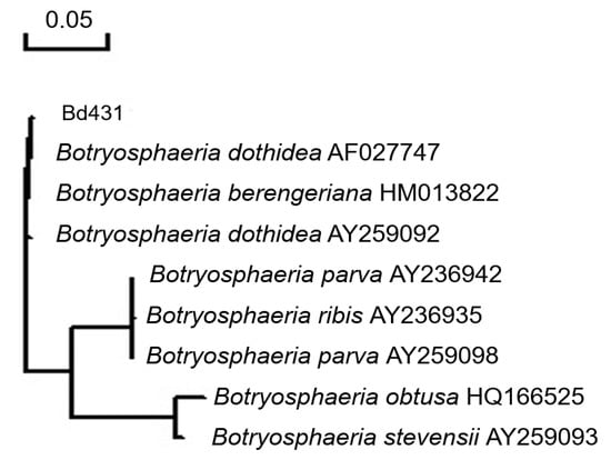 Isolates of Bd431 and Bd432 were grown on PDA for five days and mycelium was used to extract the genomic DNA by following the CTAB method described by Möller et al. [37]. DNA concentration of each sample was quantified by using a NanDrop UV spectrophotometer (NanoVue Plus, GE Healthcare Life Sciences, New York, NY, USA). Phylogenetic analyses of ITS, translation elongation factor 1-α, and beta-tubulin were used to identify B. dothidea [38], so the three genes were used in our study. Primers ITS1 and ITS4 were used to amplify the ITS region of DNA [39], while amplification of partial β-tubulin gene was accomplished by the primers Bt2a and Bt2b [40], and for the partial elongation factor 1α gene with the primers EF1-728F and EF1-986R [41].
