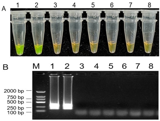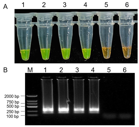 Initial LAMP reaction conditions were selected and modified based on a prior study [44]. Initially, LAMP reactions were carried out in a 25-μL volume, which contained 4 U of a large fragment of Bst DNA polymerase (New England Biolabs), 2.5 μL of 10 × ThermoPol Buffer (New England Biolabs), 4 mM MgSO4 (New England Biolabs), 1 mM dNTP, 1.4 μM each FIP and BIP, 0.2 mM each F3 and B3, 0.8 M betaine, and 1 μL target DNA, with ddH2O being added to a final volume of 25 μL. As a control, ddH2O was instead used. Reaction mixtures were then incubated for 60 min at 60 °C, after which they were heated for 10 min to 80 °C to terminate the reaction via enzymatic inactivation. Next, we added 1 μL of SYBR Green I (1000×) per reaction tube. Positive reactions yielded a fluorescent yellow-green color that was readily detectable to the naked eye, while negative reactions remained brown. The resulting products were analyzed by 1% agarose gel electrophoresis, and experiments were repeated two times.