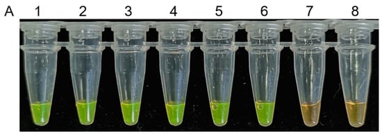 The sensitivity of this LAMP assay was determined by using DNA serial 10-fold dilutions of DNA from a B. dothidea isolate (Bd-432) and was subjected to serial 10-fold dilution (10 ng to 10−6 ng). This assay has the potential to detect as low as 10−5 ng of DNA, with clear color changes and DNA ladder products consistent with a positive reaction (Figure 6), demonstrating high sensitivity of the assay for the detection of B. dothidea isolates.