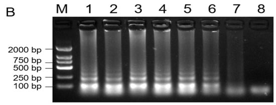 The polymerase chain reaction (PCR) was performed in an iCycler Thermal Cycler (Bio-Rad Laboratories Inc., Hercules, CA, USA) in a final volume of 25 μL containing 12.5 μL of 2 × PCR mix (Sangon Biotech Co., Ltd., Shanghai, China), 1.5 μL of each primer (10 μM), 1 μL of DNA (10 ng), and 8.5 μL of double-distilled H2O. The PCR conditions include the 3 min duration for the initial denaturation at 94 °C; followed by 35 cycles of 30 s at 94 °C, 30 s at 55 °C, and 90 s at 72 °C; and a final extension of 10 min at 72 °C. The resulting PCR products were analyzed by gel electrophoresis in a 1% agarose gel in 1 × Tris-borate-EDTA buffer and sequenced by Sangon Biotech Co., Ltd. (Shanghai, China). Amplified sequence was compared with the other sequences found in the National Center for Biotechnological Information (NCBI) database (http://www.ncbi.nlm.nih.gov, accessed on 20 February 2021) using Basic Local Alignment Search Tool (BLAST) [42].