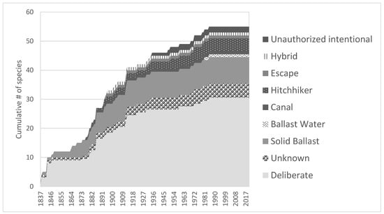 The history of nonindigenous aquatic plants in the Great Lakes is long and differs markedly from the overall pattern of invasion for the Great Lakes []. Records show that the first nonindigenous aquatic plant (Rumex obtusifolius) was introduced to the Great Lakes basin around 1837 []. Forty aquatic plant species were introduced prior to 1920, while only 15 were introduced within the last century, with the peak rate of introduction occurring in the early 1880s (Figure 1). Fifty-five percent of the introductions of nonindigenous plants to the Great Lakes are attributed to deliberate introductions, while 18% came from shipping vectors (solid ballast and ballast water). This contrasts with the pattern for all nonindigenous introductions to the Great Lakes, which peaked in the late 1990s, with 20% of the introductions (including plants) associated with deliberate introductions and 40% associated with shipping []. Aquatic nonindigenous plants thus form a unique subset of the overall invasion of the Great Lakes.