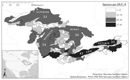 - Lower, E.; Sturtevant, R.; Iott, S.; Martinez, F.; Rutherford, E.; Mason, D.; Elgin, A. The Great Lakes’ Most Unwanted: Characterizing the Impacts and Traits of the Top Great Lakes Invasive Species. Aquat. Invasions 2020, submitted. [Google Scholar]