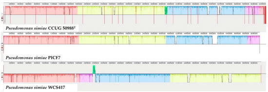 A previous multi-locus sequence analysis (MLSA) using concatenated partial sequences of six housekeeping genes showed that strain PICF7 clustered with Pseudomonas simiae WCS417 [6]. In order to confirm the taxonomy of PICF7, its full genome was compared with the genomes of P. simiae WCS417 [43] and the reference strain Pseudomonas simiae CCUG 50988T [44] (Figure 1). Alignment using the MAUVE tool showed that P. simiae CCUG 50988T, P. simiae WCS417 and P. fluorescens PICF7 are nearly identical except for some small genomic islands that are unique for each of the strains. The average nucleotide identity (ANI) algorithm using BLAST (ANIb) analysis showed that PICF7 shared 99.38% average nucleotide identity with P. simiae CCUG 50988T and 99.35% with P. simiae WCS417 (http://jspecies.ribohost.com/jspeciesws/#genomesdb-detail;id=23494 (accessed on 17 January 2020)). The same colors shown in Figure 1 correspond to similar genomic regions present in the three strains. White gaps indicate genomic regions not shared among the analyzed strains. The small genomic region marked in a green color is present in the genomes of P. simiae WCS417 and in the P. simiae type strain but is missing in PICF7. Thus, results showed a high identity level among the three genomes, confirming strain PICF7 as P. simiae.