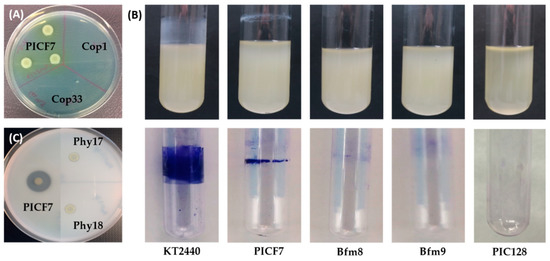 Phenotypes altered in selected Pseudomonas simiae PICF7 mutants. (A) Cop1 and Cop33 mutants are unable to grow on LB agar plates supplemented with 4.5 mM CuSO4·5H2O (image taken 3 days after bacterial inoculation. (B) Mutants Bfm8 and Bfm9 are defective in producing biofilm. Upper image shows borosilicate tubes containing the bacterial cultures in LB medium. Lower image shows the result obtained after performing the staining procedure with crystal violet and the inner surface-adhered bacteria. (C) Mutants Phy17 and Phy18 are impaired in phytase activity when assayed in Phytase Specific Medium (PSM) (picture taken 3 days after bacterial inoculation). See the Materials and Methods section for full experimental details. PICF7, P. simiae PICF7; KT2440, Pseudomonas putida KT2440. These strains were used as positive controls. PIC128, Pseudomonas indica PIC128 was used as a negative control.