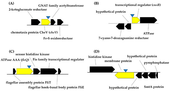 Schemes representing the Tn5-TcR insertion sites (within genes shown in yellow color) in the genome of the Pseudomonas simiae PICF7 selected mutants. (A), Mutant Cop1; (B), Mutant Cop33; (C), Mutant Bfm8; (D), Mutant Bfm9. The approximate transposon insertion sites are shown as inverted blue triangles.