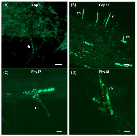 Confocal laser scanning microscopy images of root hairs from olive (cv. Picual) internally colonized by GFP-labeled PICF7 mutants. Images are representative of colonization events photographed from 5 to 10 days after root bacterization. Scale bar represents 50 μm in panels (A,B), and 20 μm in panels (C,D). rh, root hair.