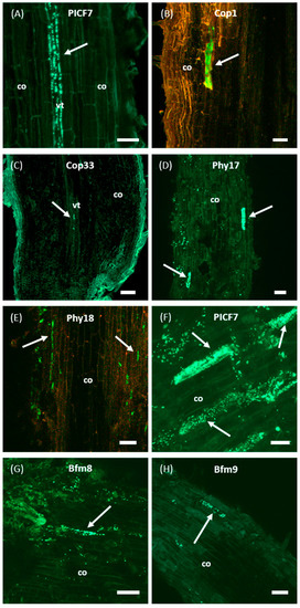 Confocal laser scanning microscopy images of olive (cultivar Picual) roots colonized by GFP-labeled Pseudomonas simiae PICF7 and its selected Tn5-TcR insertion mutants. Images show inner colonization events of different root tissues by wild-type PICF7 (panel (A)), and mutants Cop1 (B), Cop33 (C), Phy17 (D) and Phy18 (E). Additionally, colonization of olive root surface by wild-type PICF7 (panel (F)) and biofilm mutants Bfm8 (G) and Bfm9 (H) are also shown. Images are representative of the colonization events observed and were taken from 4 to 17 days after root bacterization with fluorescently labelled derivatives. Scale bar represents 50 μm in all panels, except in ((C), 100 μm) and ((F), 20 μm). White arrows point to spots or microcolonies of the inoculated bacteria. co, cortical cells; vt, vascular tissue. In panels (B,E), the red channel was added to increase plant tissue contrast and improve visualization.