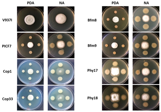 Regarding biofilm-impaired mutants (Bfm8 and Bfm9), results showed a significantly (p < 0.05) higher V. dahliae growth inhibition exerted by mutants Bfm8 (Experiment I, both culturing media) and Bfm9 (Experiment II, only in PDA) compared to inhibition percentages scored for the wild-strain PICF7. However, results scored for these mutants varied between experiments. Finally, mutants unable to grow in culturing media amended with copper, Cop1 and Cop33, did not show significant differences in their ability to inhibit V. dahliae growth compared to the wild-type strain (Table 2). It is worth mentioning that V. dahliae displayed altered mycelium growth on NA plates when Cop mutants were present. This phenomenon was not observed for the other interactions here examined (Figure 6).