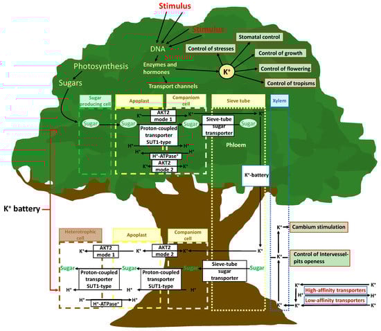 Plant tissues with sufficient energy and ATP availability can load K+ to the phloem, which reaches a notable concentration, and the sap flow transports K+ to organs requiring it; K+ can also return to roots [114,115]. This transport creates a K+ gradient between the apoplast and sieve phloem-accompanying cells, as well as an energetic mobile gradient along the phloem, which acts as a useful energy store for alleviating local energy limitations; this phenomenon facilitates the activation of protein transmembrane transporters [34]. This energy can be used by AKT2 K+ channels, which can shift an ATP-independent mechanism that helps remote tissue cells reload carbohydrates or release K+ and nutrients to phloem. The created transmembrane K+ gradient can thus be conducted by phloem flux and thereafter from the cytosol of the sieve phloem-accompanying cells to the apoplasts and cytosols of foliar, shoot, and root cells, and it can be used to transport metabolites through the openings of specific protein transmembrane channels, such as AKT2-like channels, by the passage of K+ across the membrane [34] (Figure 2). In this way, plant cells of different tissues can exert a remote control of transport processes of nutrients, including K+ and carbohydrates, by locally regulating membrane ATPases and the AKT2 K+ transporter function [116]. The control of the ATK2 K+ transporter mode of function is crucial in this complex mechanism. The sensitivity and capacity of this mechanism seems to be distinct among plant species, and can even be stimulated differently by different biotic and abiotic circumstances and variables [117], as another K+-related plant function that can have a great ecological importance, with ample room for further research.