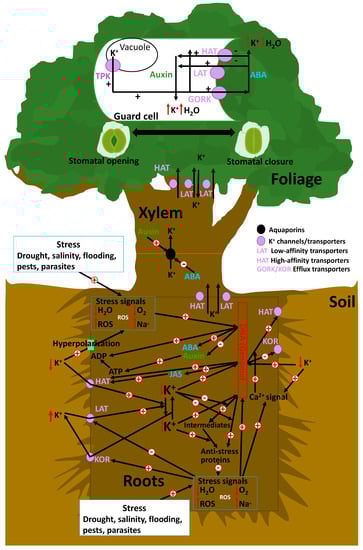 Movements of K+ across the membranes of cells or organelles are also responsible for the final response in the cascade of effects from stimulus to response in plants. Adequate cellular K+ concentrations are necessary for plants to respond properly to various types of stress, such as drought, salinity, flooding, or herbivores [26,118,119].