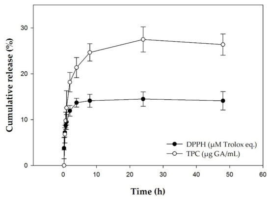 In vitro release profile of CRPP extract inclusion system as a function is presented in Figure 1. The release of the total phenolic compounds and the antioxidant activity reach practically a plateau in 8 h.