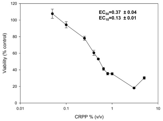 Sigma Plot Software (version 10) was used for estimating the EC50 value (the CRPP concentration where a 50% decrease in the control’s cell viability is observed) from the dose-response curves through the regression analysis via the four-parameter logistic curve. The EC10 value (the CRPP concentration where a 10% decrease in the control’s cell viability is observed) was calculated through the QuickCalcs online calculator (http://www.graphpad.com/quickcalcs/Ecanything1.cfm) by GraphPad Software with the formula: