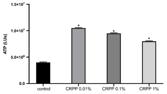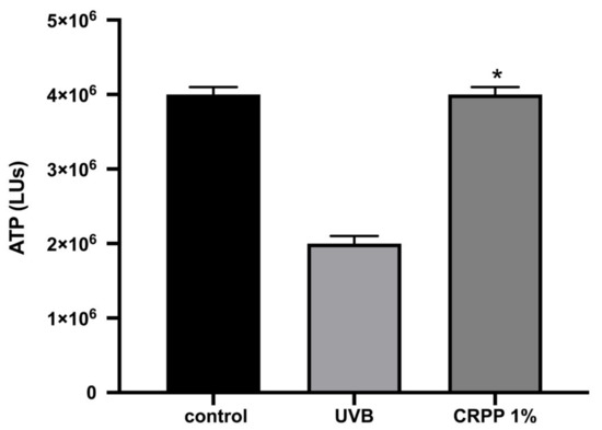 NHDF cells were subjected to UVB irradiation (UVB = 312 nm). Specifically, 3.5 × 103 NHDF cells were seeded in 6-well plates and cultured for 24 h in culture medium before a 48 h incubation with 1% v/v CRPP. After incubation and prior to UVB exposure the cells were washed two times with PBS (Life Technologies, Thermo Fisher Scientific, Waltham, MA, USA) to prevent direct intramolecular reactions. Then PBS was added to the cells and the cells were exposed for 20 min, at UVB irradiation. During UVB treatment a control was included. After the UVB exposure culture media was added for an additional 20 min, finally, the ATP levels were assessed following the previously mentioned procedure. The radiation dose of 0.3 J/cm2 for UVB irradiation. UV irradiation was achieved was a UV-lamp VL-8.LM (Vilber Lourmat, Collégien, France) in two wavelengths.