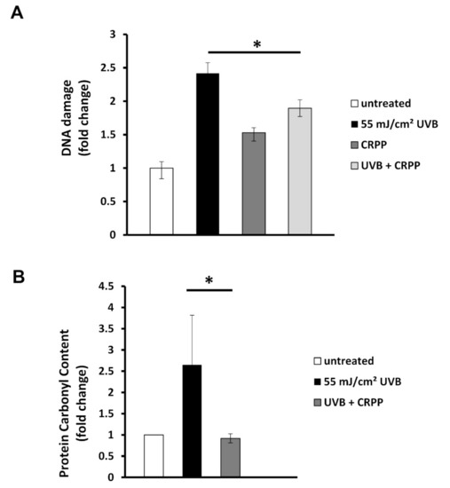 Next, we examined the anti-mutagenic and anti-oxidative potential of CRPP on a human immortalized skin cell line by employing single cell electrophoresis and measuring the protein carbonyl levels upon UV irradiation and application of the CRPP. Our results demonstrate that CRPP can readily protect HaCaT cells against the mutagenic effects of UV radiation and lower the UV-induced protein carbonyl content, respectively. We further investigated the photoprotective and anti-ageing role of CRPP in a reconstituted human skin tissue model. Application of the CRPP protected the reconstituted skin tissues from UVB-induced lesions and decreased the UVB-induced expression of matrix metalloproteinases, a molecular marker of photoaging, at both mRNA and protein level.