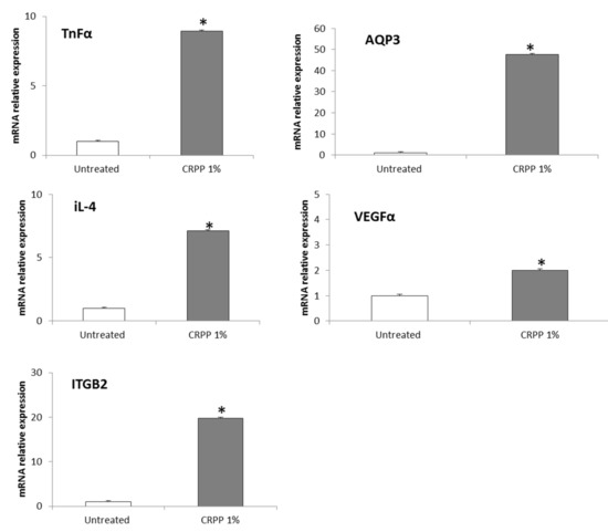 Moreover, transcript of AQP3 were upregulated in NHDF cells treated with CRPP in contrast to control cells. This outcome potentially underlines the stimulatory role of CRPP in cell proliferation in an AQP3-dependent manner. It has been reported that transcripts of AQP3 promote cell proliferation related to cell migration process [65,66]. Specifically, Cao C et al. [66]. demonstrated that up-regulation of AQP3 plays an important role in cell proliferation related to wound healing process through facilitating of fibroblasts migration by EGF/EGFR signaling.