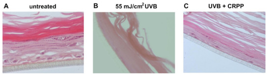 EpidermTM EPI-200 tissues were topically treated in the apical surface with 0.1% (v/v) CRPP (diluted in the EPI-100 Assay medium) for 2 h and then washed 3 times with 1 times PBS through gentle pipetting. Then, the culture media, in which the lower surface was exposed, was replaced with PBS, the skin tissues were irradiated with 55 mJ/cm2 UVB and they subsequently treated in the apical surface again with 0.1% (v/v) CRPP for 2 h. Finally, culture inserts were placed in fresh EPI-100 Assay medium and skin tissues were allowed to recover for 24 h.