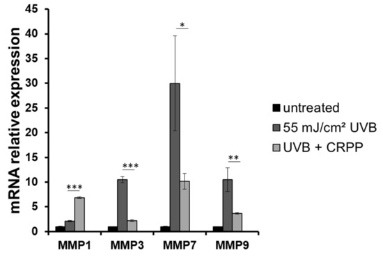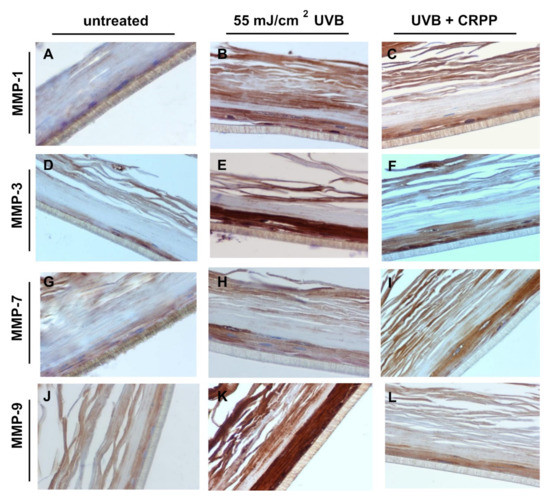 Immunohistochemistry was performed as described earlier [43]. For immonohistochemistry EpidermTM EPI-200 tissues were collected 24 h post UVB irradiation and treatment with CRPP, fixed in formalin and then embedded in paraffin. Tissue sections of two-micron (2 µm) were then deparaffinized, rehydrated and treated with 0.3% H2O2 in methanol (5 min) to prevent endogenous peroxidase activity and were subsequently immunostained by the peroxidase method (Envision System, DAKO, Carpinteria, CA, USA) according to the manufacturer’s instructions. In brief, after antigen retrieval and endogenous peroxidase blockade, sections were blocked with Protein Block Serum-Free (DAKO) and incubated overnight (4 °C) with the monoclonal or polyclonal antibodies against MMP-1 (mouse-raised), MMP-3 (rabbit-raised), MMP-9 (mouse-raised) (all from Acris, Herford, Germany) and MMP-7 (Proteintech, Machester, UK) in 1:750, 1:100, 1:900 and 1:100 dilutions, respectively. Sections were then incubated with the respective secondary antibodies for 60 min (RT). Finally, sections were counterstained with 0.05% diaminobenzidine (10 min) and Mayer’s hematoxylin, mounted and examined under a Nikon Eclipse 50i microscope. Control slides were incubated for the same period with non-immunized rabbit or mouse serum. An independent pathologist evaluated the results on the basis of the percentage of stained cells in the sample.