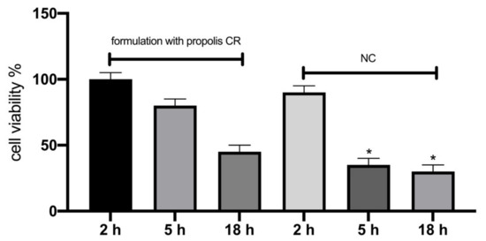 Cell viability levels expressed as mean ± SEM based on reconstituted skin model for: Reconstituted skin model treated with a cosmetic formulation with 1% CRPP and 1% triton-100 as negative control (NC). *—p < 0.05 significantly different from the formulation.