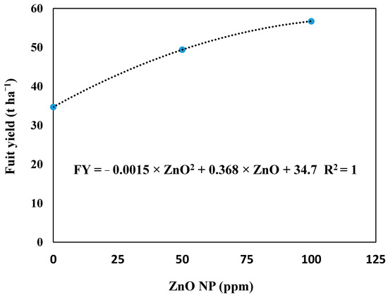 Water deficit exposure noticeably decreased fruit yield by 17% in comparison to FI, fruit yield was also affected by exogenous application of 50 or 100 ppm ZnO NP that increased by 42.4% and 63.4%, respectively, compared with DI × ZnO NP(0). The greatest fruit yield corresponded with the integrative application of 100 ppm ZnO NP and FI treatment. However, combined exogenously applied 50 or 100 ppm of ZnO NP and water deficit at 60% ETc exhibited higher fruit yield by 12.2% and 22.6%, respectively, than those obtained with FI + ZnO NP(0) treatment. As shown in Figure 2, the regression analysis among fruit yield and ZnO NP concentration was a curvilinear relationship, indicating increasing fruit yield with increasing ZnO NP concentration.