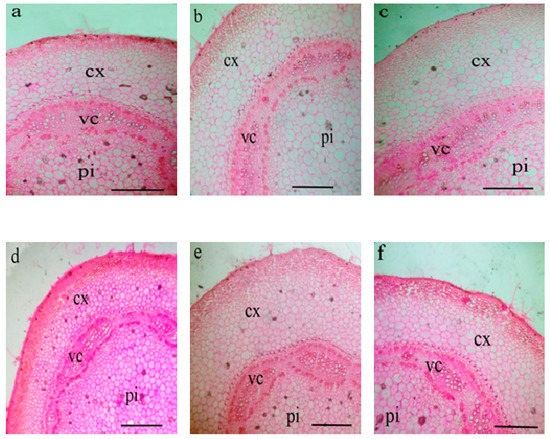 Transverse section in eggplant stem as influenced by foliar application with ZnO nanoparticles (ZnO NP) under full (FI) and deficit (DI) irrigation. (a) FI × ZnO NP(0), (b) FI × ZnO NP(50), (c) FI × ZnO NP(100), (d) DI × ZnO NP(0), (e) DI × ZnO NP(50), (f) DI × ZnO NP(100). Scale bar = 350 μm. (cx = cortex, vc = vascular cylinder, pi = pith).