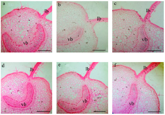 Transverse section in eggplant leaf as influenced by foliar application with ZnO nanoparticles (ZnO NP) under full (FI) and deficit (DI) irrigation. (a) FI × ZnO NP(0), (b) FI × ZnO NP(50), c: FI × ZnO NP(100), (d) DI × ZnO NP(0), (e) DI × ZnO NP(50), (f) DI × ZnO NP(100). Scale bar = 350 μm. (lb = leaf blade, vb = vascular bundle).