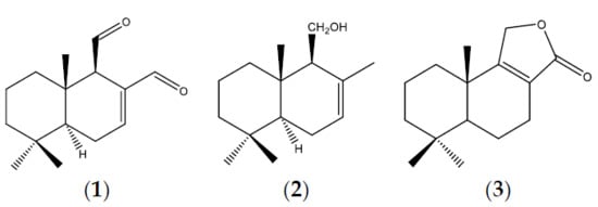 Compounds 1–3 were isolated from EtOAc extracts of leaves of P. acuminata. The isolation of the pure compounds was performed according to previously reported procedures [19,20,21]. Compounds 1–3 were identified by micromelting point, optical rotation, and spectroscopic data, including 1H and 13C Nuclear Magnetic Resonance and were compared with authentic samples obtained previously in our laboratory [19,28] for polygodial (1) or with the literature data, for drimenol (2) and confertifolin (3) [29,30]. Chemical compound descriptions and spectroscopic data are presented in the Supplementary Material (Figures S1–S6 and S11).