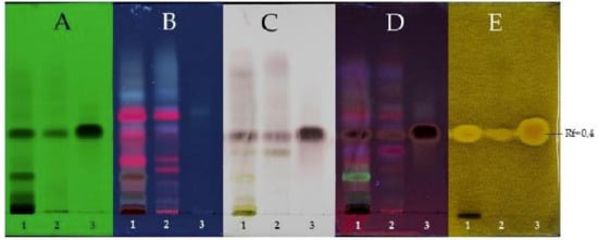 - Saxena, G.; Farmer, S.; Towers, G.H.N.; Hancock, R.E.W. Use of specific dyes in the detection of antimicrobial compounds from crude plant extracts using a thin layer chromatography agar overlay technique. Phytochem. Anal. 1995, 6, 125–129. [Google Scholar] [CrossRef]