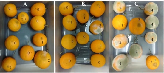 The fruits were stored at 20 °C for 14 days (oranges) or 10 days (peaches) in accordance with the disease evolution of the control sets. After storage, the degree of P. digitatum (for oranges) or M. fructicola (for peaches) sporulation on the surface of decayed fruits was evaluated on a 0 to 4 scale (sporulation index). In this scale, the incidence and severity of the disease were visually quantified assuming the following values: 0 (negligible sporulation); 1 (fruits with lesions up to 10% of its surface); 2 (fruits with injuries between 10 and 30% of its surface); 3 (fruits with lesions between 30 and 50% of its surface) and 4 (refers to a dense fungal sporulation over the entire fruit that infected in more than 50% of its surface). The index value for each fruit was treated as a replicate, and each treatment mean was subjected to statistical analysis [27,34,35].