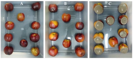 Pictures showing M. fructicola sporulation index (0 to 4 scale, in which the value 0 was assigned to negligible sporulation and 4 referred to a dense fungal sporulation over the entire fruit) on wound-inoculated peaches treated with Persicaria acuminata EtOAc extract (A), commercial Carbendazim (B) and the control set, (C) without any treatment.