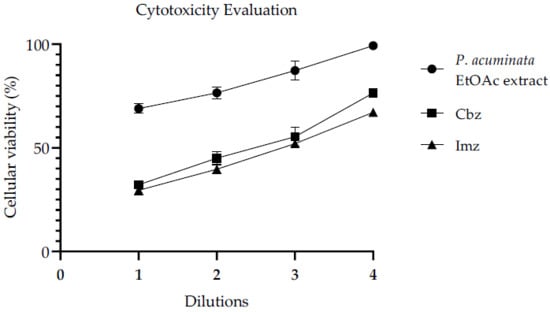 As shown in Figure 6, the viability of Huh7 cells was 76.27 ± 2.86%, 45.74 ± 3.08% and 41.74 ± 2.07% in the presence of P. acuminata EtOAc extract, Cbz and Imz, respectively, at their MICs values (2-fold dilutions). This means that the extract seems to be less cytotoxic than commercial antifungals at the concentrations evaluated by this method, since the higher cellular viability values means lower cytotoxicity. Notice that the abscissa axis shows the serial dilutions from the most concentrated sample solutions (dilutions 1), which are twice as concentrated as their MIC values (2-fold dilutions), and so on. Therefore, 4-fold dilutions are represented as the most dilute solutions of each sample, and they present the highest cellular viability.