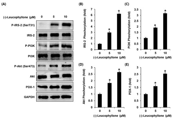 Effect of (-)-leucophyllone on the protein expression levels of insulin receptor substrate-2 (IRS-2) (Ser731), P-IRS-2, P-phosphatidylinositol 3-kinase (PI3K), PI3K, P-Akt (Ser473), Akt, and pancreatic and duodenal homeobox-1 (PDX-1) in INS-1 cells. (A) Protein expression levels of P-IRS-2 (Ser731), IRS-2, P-PI3K, PI3K, P-Akt (Ser473), Akt, PDX-1, and glyceraldehyde 3-phosphate dehydrogenase (GAPDH) in INS-1 cells treated or untreated with 5 and 10 μM (-)-leucophyllone for 24 h. (B–E) Each bar graph presents the densitometric quantification of western blot bands. * p < 0.05 compared to the control (0 μM).