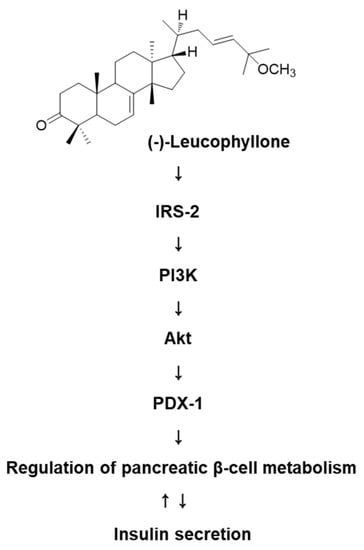 Treatment with (-)-leucophyllone at 5 μM and 10 μM increased the protein expression of IRS-2, PI3K, Akt, and PDX-1 compared to the untreated controls in INS-1 cells (Figure 3). These results suggested that (-)-leucophyllone upregulated PDX-1 expression via the IRS-2/PI3K/Akt signaling pathway in INS-1 cells. A schematic illustration of the proposed mechanisms of the effect of (-)-leucophyllone on pancreatic β-cell metabolism is shown in Figure 4.