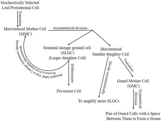Arabidopsis thaliana (Arabidopsis) protodermal leaf cells differentiate into three main cell types: unicellular leaf hairs (trichomes), pavement cells, and pairs of stomatal GCs that facilitate transpiration and exchange of gases between plant and atmosphere [1,2,3]. Stomata development from leaf protodermal cells follows the single-cell spacing rule to ensure the separation of stomata with at least a single pavement cell [4,5]. Stomata formation comprises a series of steps called stomatal lineage [6]. Stomatal lineage cells may undergo normal stomatal development by following single-cell space rules, exit the lineage, be arrested at any developmental stage, or undergo apoptosis by activating programmed cell death [3,7,8]. The cell cycle is checked and regulated by cell cycle checkpoints, which are present between each phase of the cell cycle, and decide the possible developmental fate of a cell [7].