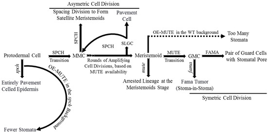 Basic helix-loop-helix (bHLH) transcription factors (TFs) such as SPEECHLESS (SPCH), MUTE, and FAMA are critical for stomatal development. Mutations in any one of these TFs result in improperly developed stomata [6,10,11,12]. SPCH regulates the transition of protodermal cells into MMCs and asymmetric cell division subsequently. SPCH-defective mutants were unable to initiate stomatal lineage, with an entirely pavement-celled epidermis phenotype. The different fate decisions of the meristemoid cells (amplifying division, spacing division, or progression down the lineage) depends on the activity and available level of SPCH (Figure 2) [12,13]. MUTE regulates meristemoids’ transition into GMCs, confirmed by arrested lineage at the meristemoid stage in a MUTE-defective mutant. Overexpression of MUTE in the spch background partially rescued spch-phenotype, and in the wild-type, it exhibited a phenotype, an epidermis densely populated with stomata (Figure 2) [10,14]. These results demonstrate that MUTE has no role in SPCH-regulated asymmetric amplification and spacing cell division [14].