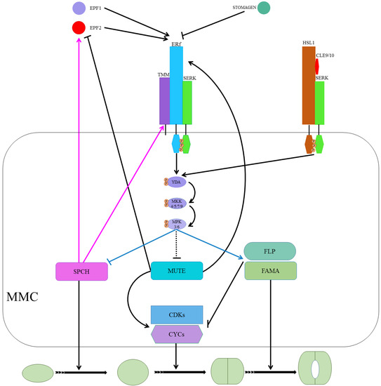 Upon completion of the ER/SERK/TMM/EPF complex, the ER/SERK cytosolic kinase domain is phosphorylated to target mitogen-activated protein kinase kinase kinase (MPKKK), which is also known as YODA (YDA), a class MPK cascade [2,36,37,38]. YDA, in turn, phosphorylates mitogen-activated protein kinase kinases (MPKKs) that phosphorylate mitogen-activated protein kinase (MPKs) that directly phosphorylate the MPK cascade’s final target [3,37,38]. Only four (MPKK4/5/7/9) and three (MPK3/4/6), out of 20 in Arabidopsis, are involved in stomatal development [37,38,39]. MPK3/6 interacted with SPCH and MPK4 with MUTE, but no in vivo or phenotypic evidence for the latter has been reported previously [36,37,40]. The MPK3/6 was unable to interact with truncated SPCH without MAPK target domain (MPKTD) and exhibited clustered stomata, as shown in Figure 3 [41]. Furthermore, signaling peptides CLAVATA3/ESR-RELATED (CLE) family genes CLE9/10 regulate stomatal lineage development perceived by receptor kinase HAESA-LIKE 1 (HSL1) in a different pathway [42]. HSL1 recruits SERKs as co-receptors in the presence of CLE9/10 for different signaling modes during stomatal development, as shown in Figure 3 [42].