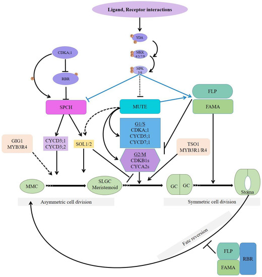 Additionally, cell cycle-related genes such as cyclins A and D (CYCA and CYCD, respectively) in association with CYCLIN-DEPENDENT KINASE A 1;1 and D1;1 (CDKA1;1 and CDKB1;1) play a key role in stomatal development [47,48]. CYCD4 participates in hypocotyl stomatal lineage divisions and CDKB1;1- and CDKA1;1-dominant negative forms, and CYCA higher-order mutants inhibit the division of GMCs [49,50,51,52]. MUTE upregulates cell cycle-related genets (CYCs and CDKs) by binding to their promoters to regulate the symmetric cell division of GMCs. FAMA binds to CDKB1;1 promoter regions, and FLP suppresses the expression of CDKB1;1 and CDKA1;1. As well, FAMA and FLP negatively regulate GMC symmetric division by repressing CDKs and CYCs [51,53,54]. Taken together, MUTE locks in the cells in the differentiation program, promotes regulators of the symmetric division of GMCs, and upregulates FLP and FAMA, which suppress regulators of the cell cycle, to control single symmetric cell division, as shown in Figure 3 [55].