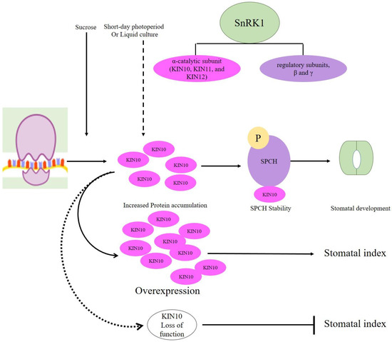 Sucrose non-fermenting-1 (SNF1)-related kinase 1 (SnRK1), especially subunit KIN10, promoted phosphorylation and stabilization of SPCH-mediates stomatal development under short photoperiod or liquid cultures (mild energy starvation of plants). Sucrose induces the accumulation of KIN10 protein by increasing its translation. Overexpression of KIN10 increases the stomatal index, whereas the loss of function of KIN10-decreases the stomatal index.