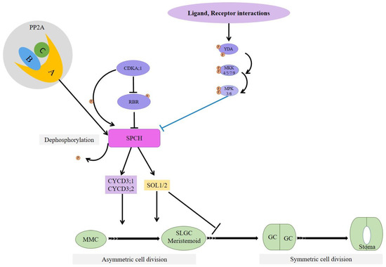 SPCH-initiated asymmetric MMC division results in unequal SPCH degradation by protein kinase signaling cascade and scaffold polarity proteins peripheral localization, BREAKING OF ASYMMETRY IN THE STOMATAL LINEAGE (BASL) and POLAR LOCALIZATION DURING ASYMMETRIC DIVISION AND REDISTRIBUTION (POLAR), result in a small meristemoid and large SLGC daughter cells that become a stoma and a pavement cell, respectively [61,62,63].