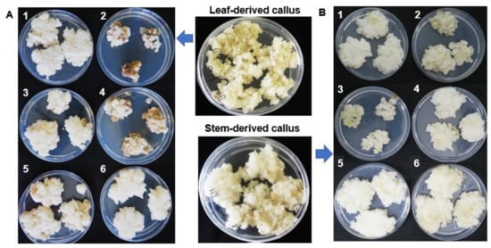 Partial callus habituation was observed (Figure 1(A3)), where leaf callus grown on MS medium with organics, without added PGRs, still maintained growth. Habituation is an occurrence in which division and growth of cells in culture become independent of added PGRs [20,28]. This was, however, not observed on stem callus maintained on PGR-free media, where reduced callus growth was observed (Figure 1(B3)).